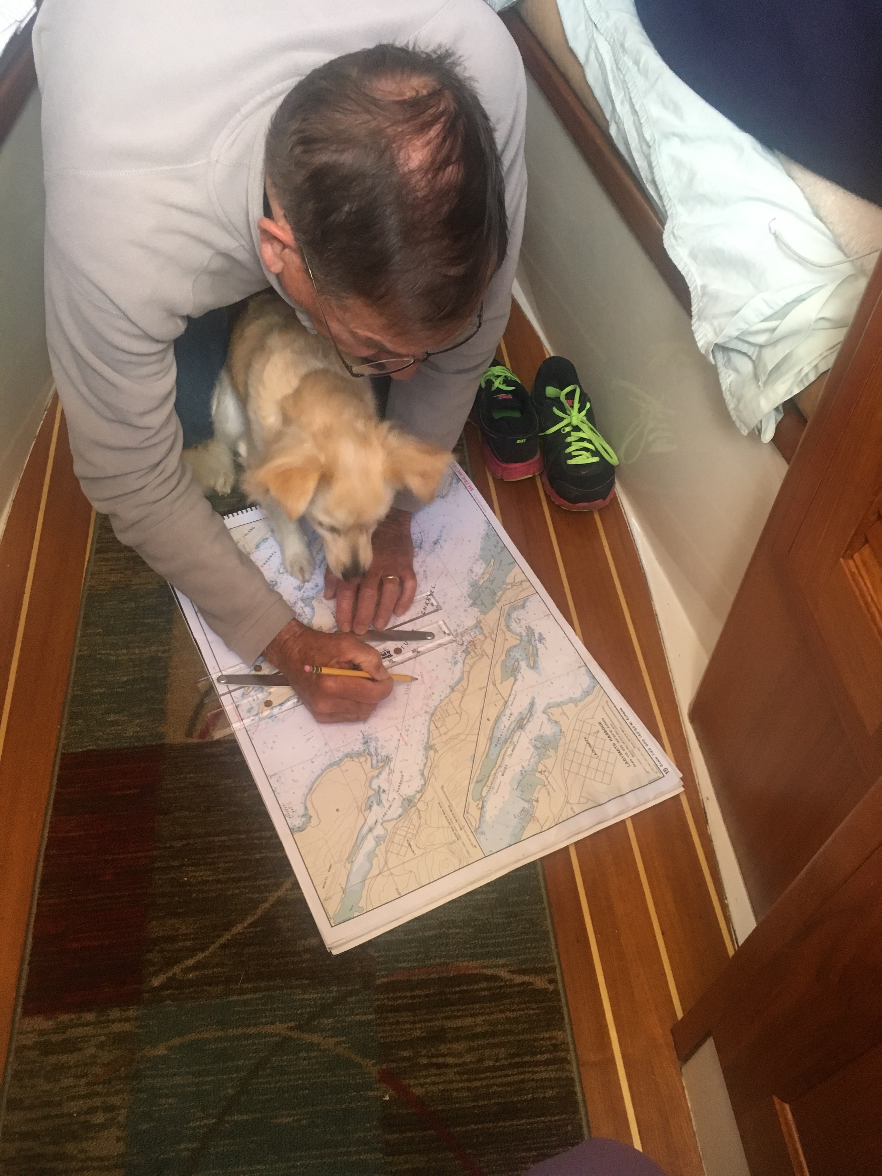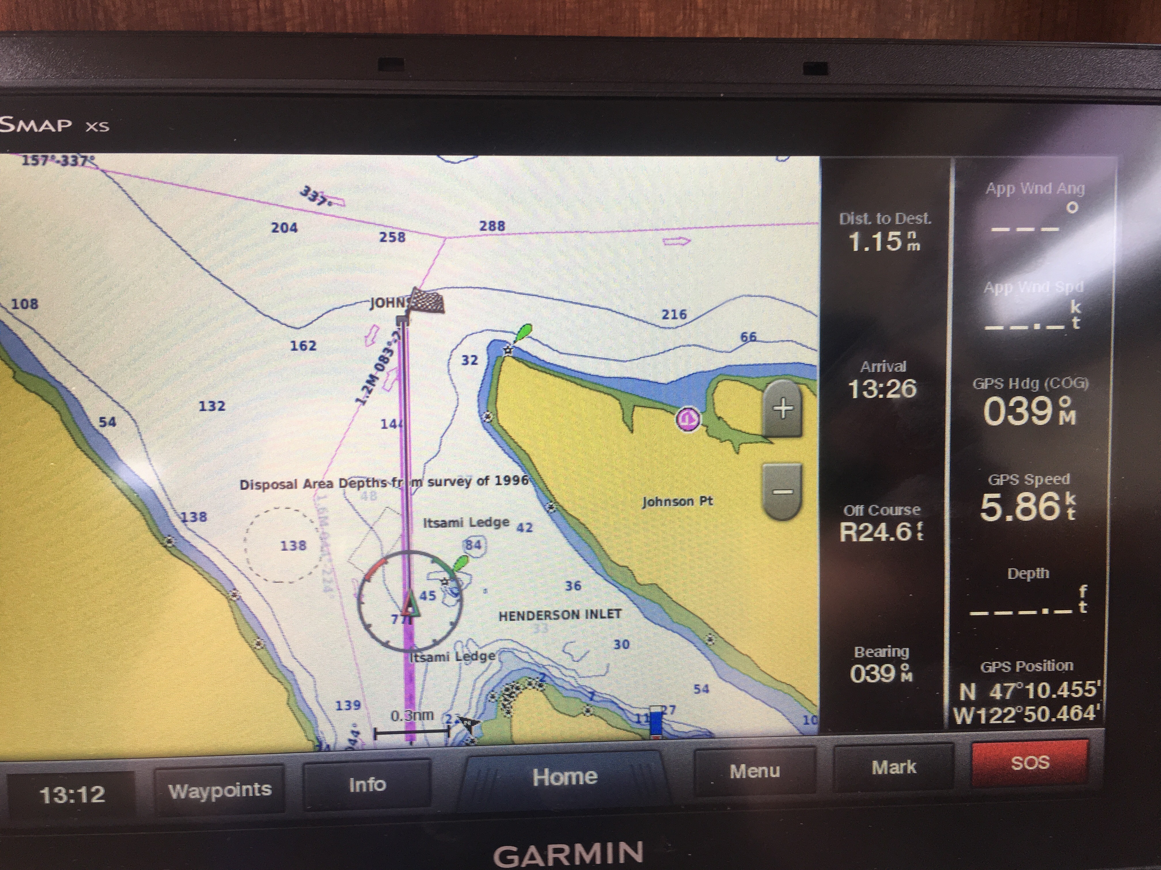 The evidence of reefs, rocks as well as shoals is everywhere and undivided attention to the nav is paramount for the safety of the vessel and crew. The picture shows Wilson and I plotting our course from Montague to Ladysmith on Vancouver Island. This will mark our furthest latitude north from home.
