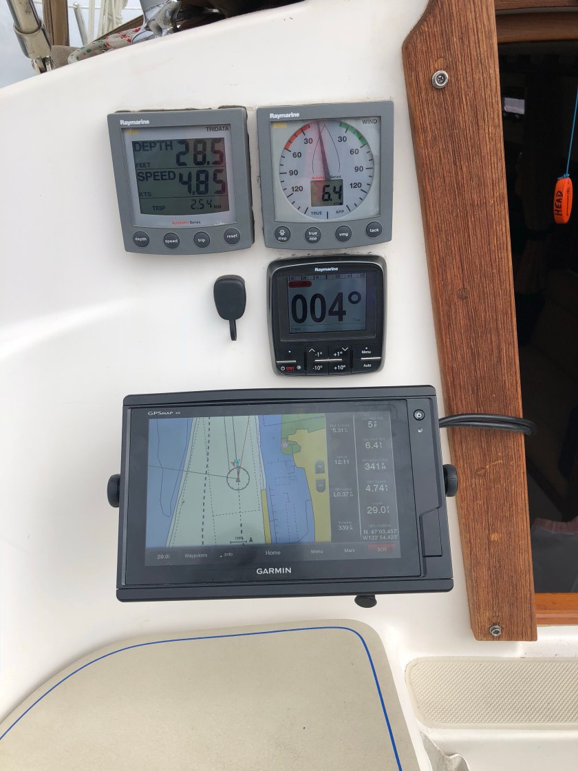 After experiencing fog last year and retreating on Voyage 01 I had Aloft Marine in Olympia install an Em-Trak AIS system which stands for Automatic Identification System which supplements my Furuno Radar. The Em-Trak interfaces with the Garmin chart plotter and overlays other vessel positions, their course, speed and contact info via VHF radio. The AIS both transmits my position to other ships as well as receives their positions. Will test it out shortly. Pretty exciting. Jason Vannice did the install. Thanks Jason!