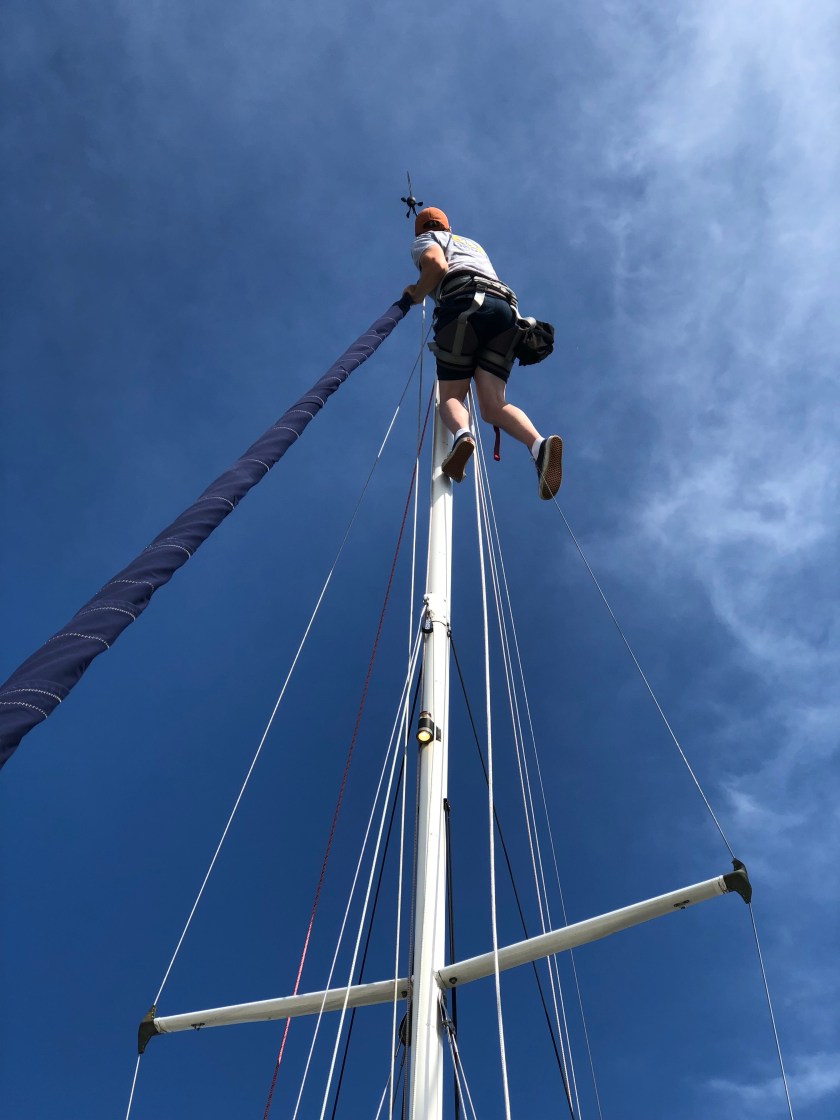 It’s important to annually go aloft on the mast to check rigging, furler, instruments and running lights. Jason Vannice with Aloft Marine did the climbing and I did the watching. You can see why I’m not climbing the mast. In this picture Jason is 37 ft above the water. Nice view I guess. One plus, he cleaned the underside of the spreader of green mold.