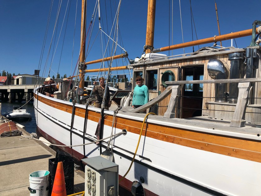 We are tied up to the linear dock and sandwiched between larger boats. This town speaks to the waterfront work for repair and care of boats of all length and tonnage. It speaks and reflects the annual wooden boat festival in September. Amidst flannel shirted guys with work pants, and women too working in the local boatyards we are in a social and cultural environment like no other on the voyage. My had lunch with my cousin Steve Park author of High and Dry who lives here and a high school classmate Dom DeBari. Cousin’s stories leave me in tears of laughter. Check out his book!
