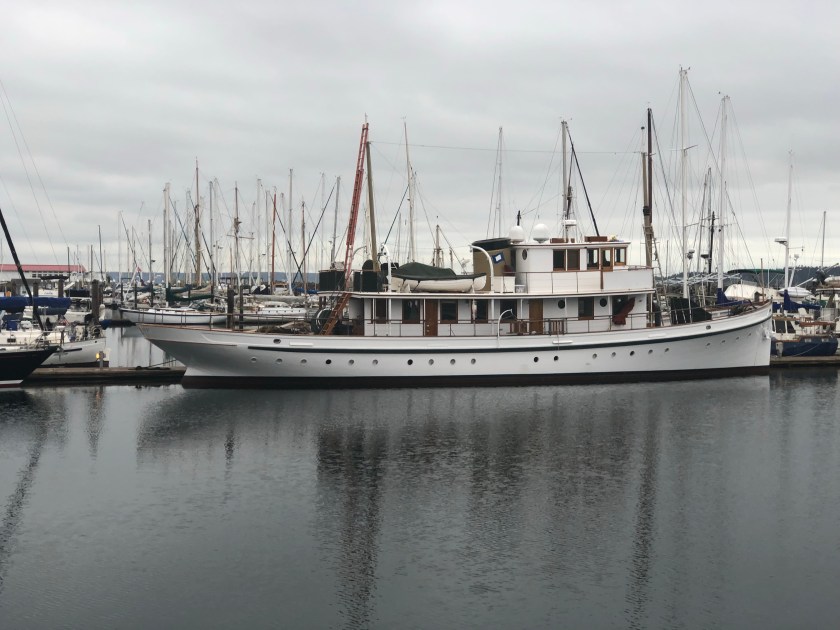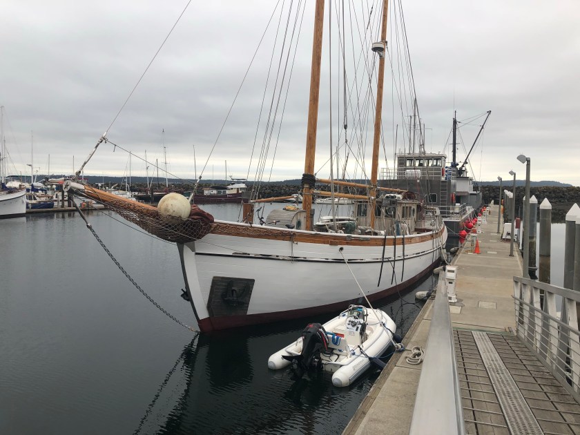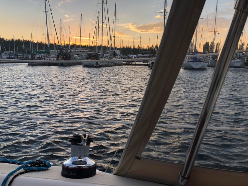 From million dollar yachts to boats in disrepair the scene is colorful, invigorating and a testimony to those who love the sea. We have met many a sojourner like us and their dogs of which there are many. It is a different life to be on a sailboat amidst these folk and their boats. Our seaworthy boat gets a lot of looks and size is of no real importance though admittedly we are small. Tomorrow we depart for Oak Bay Marina on Vancouver Island. Gale winds have subsided and we will make the 30 mile transit in 5.5 hours. Weather is expected to be good for the morning in the Straits of San Juan de Fuca. Departure music will be John Williams Jurassic Park. Fair Winds.
