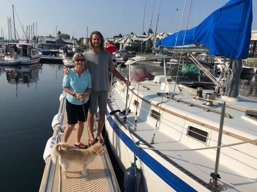 We meet many wonderful and engaging people on our journey, boaters like ourselves, and often the same boaters at different ports. We share the magic of the water and wind, the same weather and quite frequently a lot of laughter. We were thankful to our friends Brian and Louise for hosting us for three days at their lovely Brentwood cottage on the bay on Vancouver Island. And meeting young Nick, a live aboard 30 year old in Nanaimo. Below Brian rowing ashore after setting a prawn trap…ummmm! On to other islands!