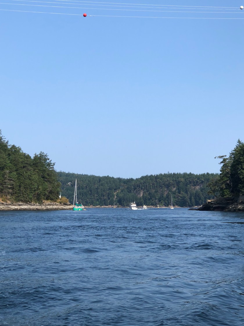 From Nanaimo we passed south through the Dodd Narrows with due respect for the currents we motored through at slack water with a 16 boat flotilla one at a time. Narrows like this one and Deception pass require careful planning as my boat only makes 6 knots under power with its 21 hp Yanmar diesel. Departure music was Handel’s “Water Music”. Weather continued hot for our 4 hour passage with light south wind on our nose. We settled in to our normal watch and easy go attitude entertained by Wilson, birds, an occasional Eagle and dolphins. No whales sighted. Ann would fix ramen now and then or Chile for lunch. On rough weather days it was peanut butter and jam. Telegraph was family run for years and we enjoyed our stay. Out in my wet suit to check zincs and found one max prop zinc depleted. So hot we spent the day in chairs under the tall cedar and fir trees. Arbitus trees in abundance as well. We stayed three days took on fuel and departed for Montague. Departure music was the well known tenor/bass duet from Bizet’s Pearl Fishers.