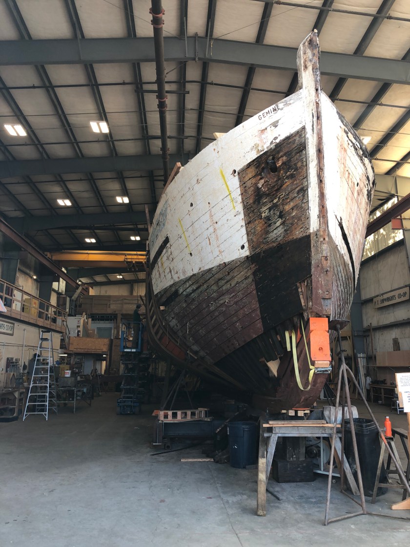 In the shipyard under heavy repair is the boat Western Flyer which John Steinbeck went on with his wife Carol and biologist Doc Ricketts sailing from Monterey to the Sea of Cortez in 1940. It is a public funded effort. See pic below.
