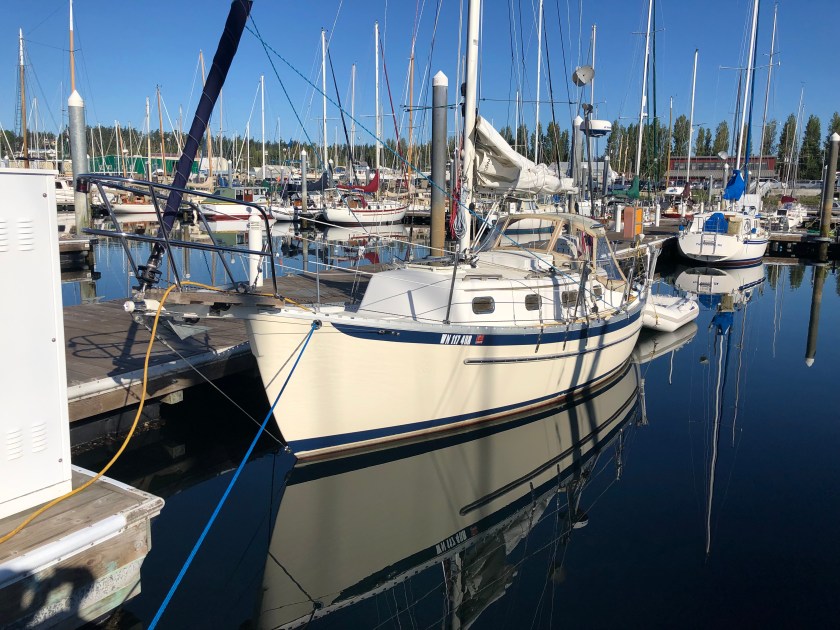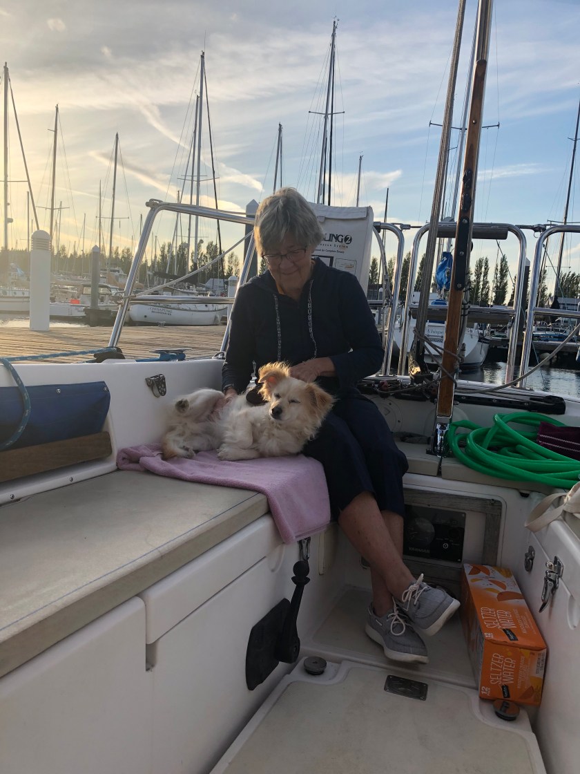 Motor/Sailed from Olympia a week ago putting into Gig Harbor, Eagle Harbor, Poulsbo and Ludlow. At 5.5 knots long distances are not within reach. So here we are in Port Townsend, Ann and I and Ensign Wilson preparing to cross the Straits of San Juan de Fuca for Friday Harbor. Tomorrow Monday 29th we have a weather window for early morning. So Voyage 3 really begins from here for our third season which will include a stop or two in Canada.