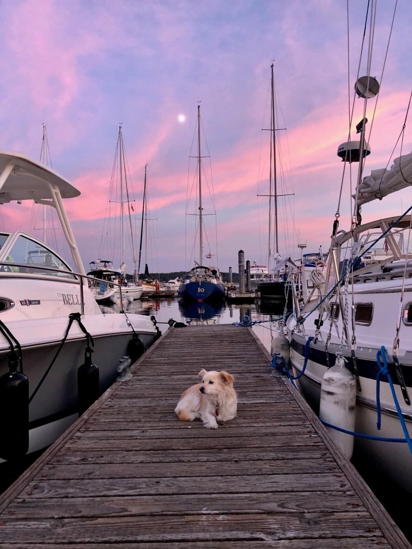 Knowing many of you are the friends of dogs here is Ensign Wilson close to sunset on watch in Deer Harbor on Orcas Island for the return of his Captain.